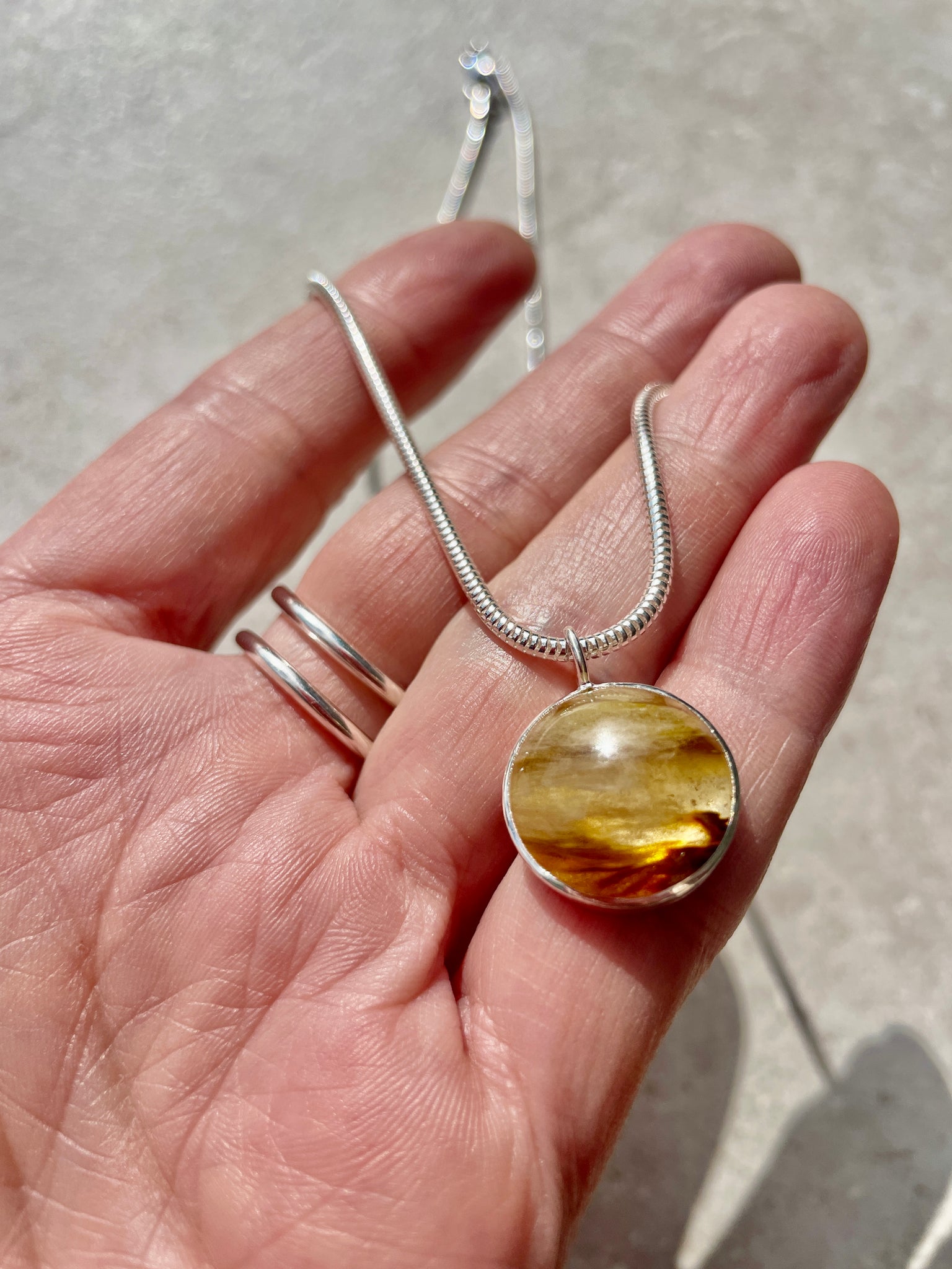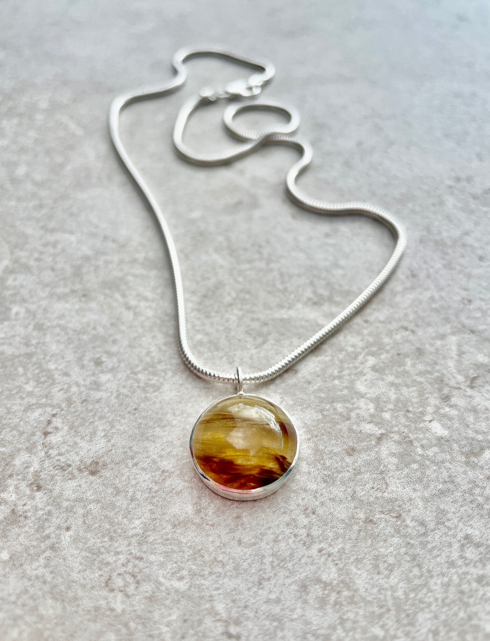 This striking necklace showcases a stunning fire agate, hand-set in recycled sterling silver. The stone glows with warm golden, honey and deep red tones, almost like the shifting atmosphere of a faraway planet or swirling galaxy. Every angle reveals new depths, giving the pendant a cosmic, otherworldly feel! This is a really lovely stone.